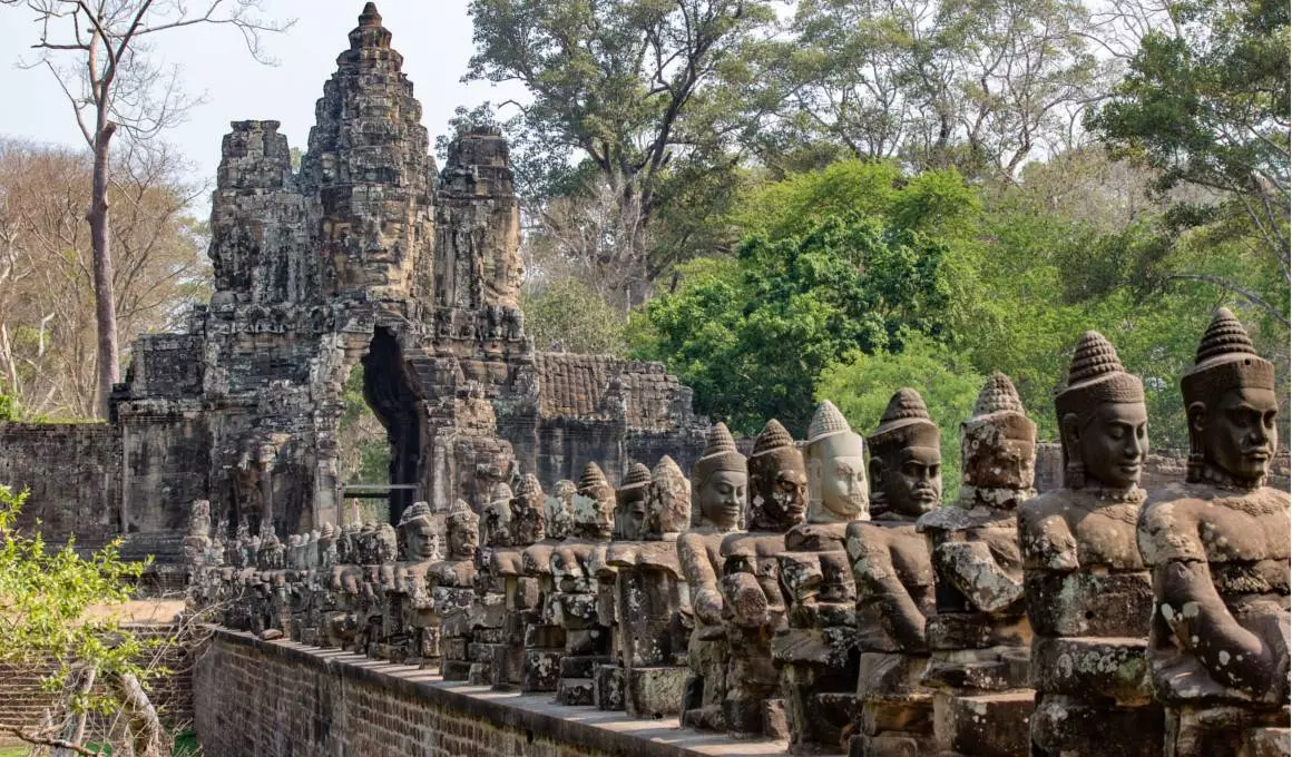 Am Morgen fahren Sie auf einer Straße, die von hunderte Jahre alten, riesigen Bäumen gesäumt ist. Urplötzlich werden Sie auf eine majestätische Steintür, den Eingang von Angkor Thom, auch als "die große Stadt" bezeichnet, treffen. Wie aus dem Nichts erscheinen neugierig lächelnde, in Stein geschnitzte Gesichter auf magische Weise – der Bayon-Tempel, errichtet etwa zwischen dem 12. und 13. Jahrhundert. Dieses erstaunliche Bauwerk ist von 54 Türmen umgeben, von denen jeder mit 4 Gesichtern verziert ist.