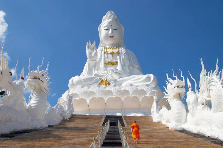 In Chiang Rai erwarten Sie zwei außergewöhnliche Tempelbauten der Moderne: der strahlend weiße Wat Rong Khun, auch als „Weißer Tempel“ bekannt, sowie der farbenprächtige Wat Rong Suea Ten, der „Blaue Tempel“. Beide vereinen traditionelle buddhistische Symbolik mit zeitgenössischer Kunst auf faszinierende Weise.